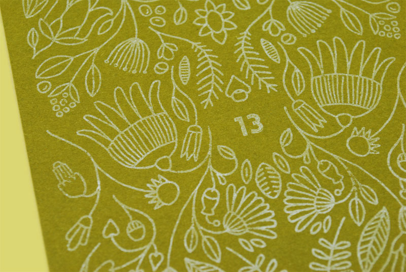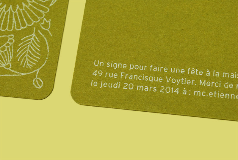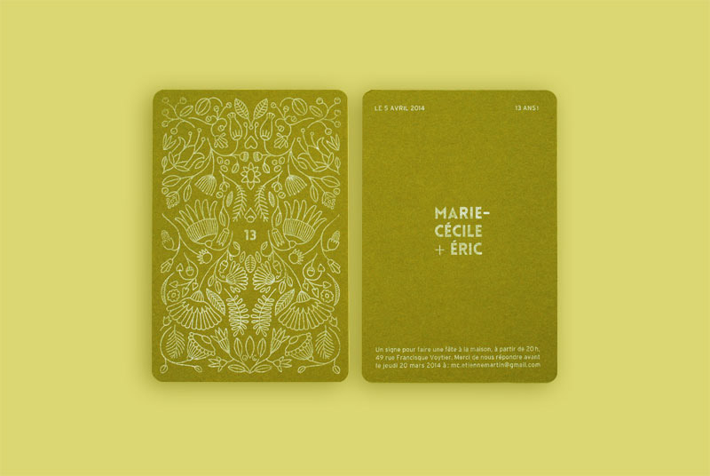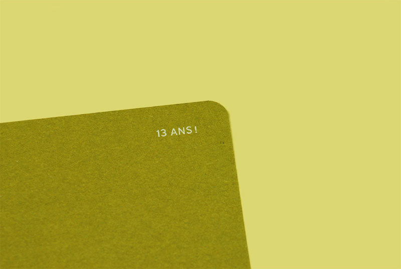 13 ans ! Création du carton d’invitation des 13 ans de mariage de Marie-Cécile et Éric Martin — 50 cartes postales (10,5 × 15 cm, impression gocco), 2014 — Marie-Cécile et Éric Martin, Saint-Étienne