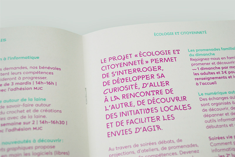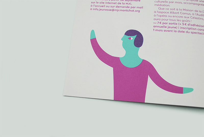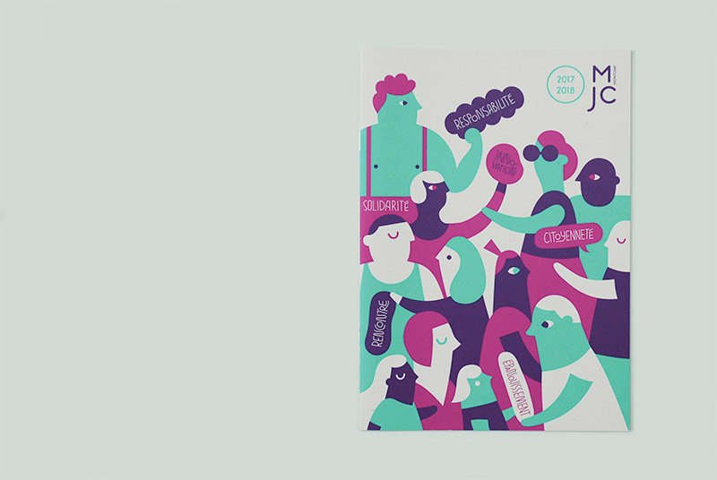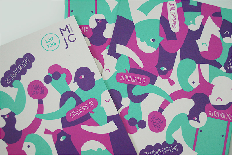 Programme 2017-2018 Illustrations et mise en page du programme des activités 2017-2018 de la MJC — brochure (16 p., 14,8 × 21 cm, impression 2 couleurs), 2017 — MJC Montchat, Lyon