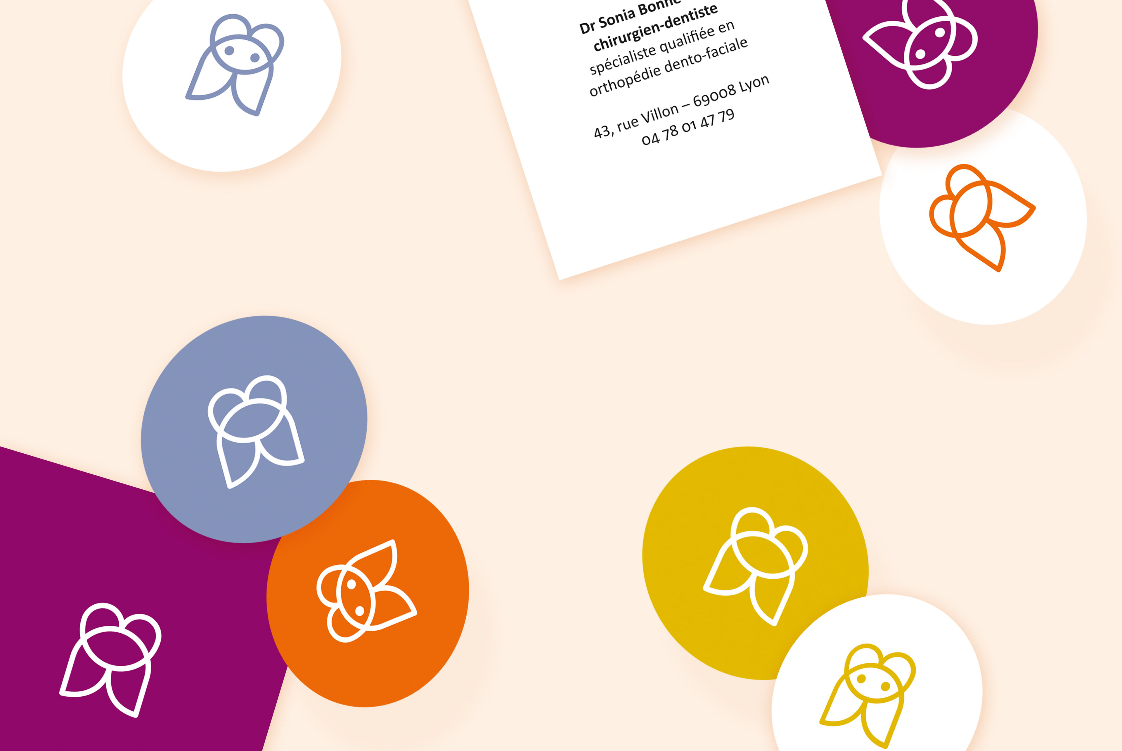 Sonia Bonne-Riahi Création de l'identité du Docteur Sonia Bonne-Riahi, chirurgien-dentiste. Déclinaison du logo en deux versions dont l'une s'adresse aux enfants — cartes de visite, papeterie, autocollants, 2016 — Sonia Bonne-Riahi, Lyon