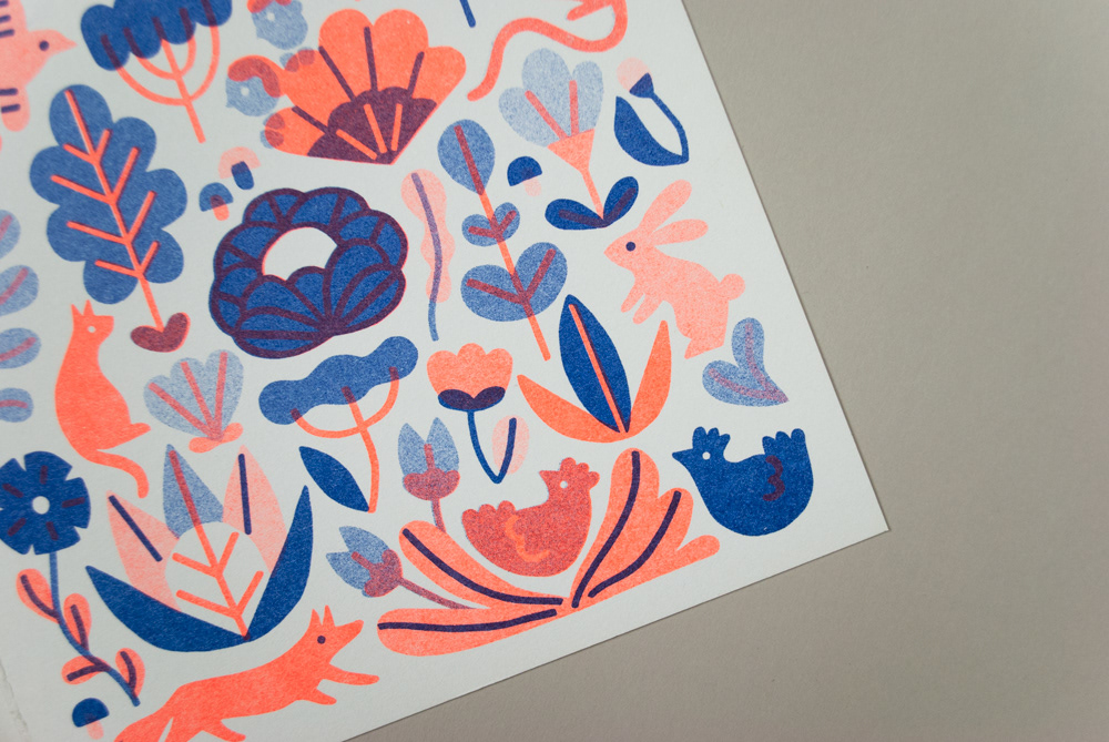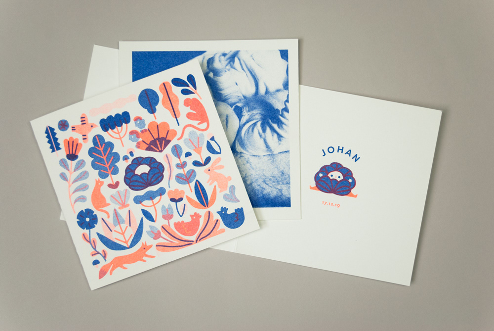 Johan Création du faire-part de naissance de Johan — 150 cartes (14 × 14 cm, risographie 2 couleurs), 2020 — impression réalisée par Super Banco, Brest — Fanny et Janjan, Saint-Étienne