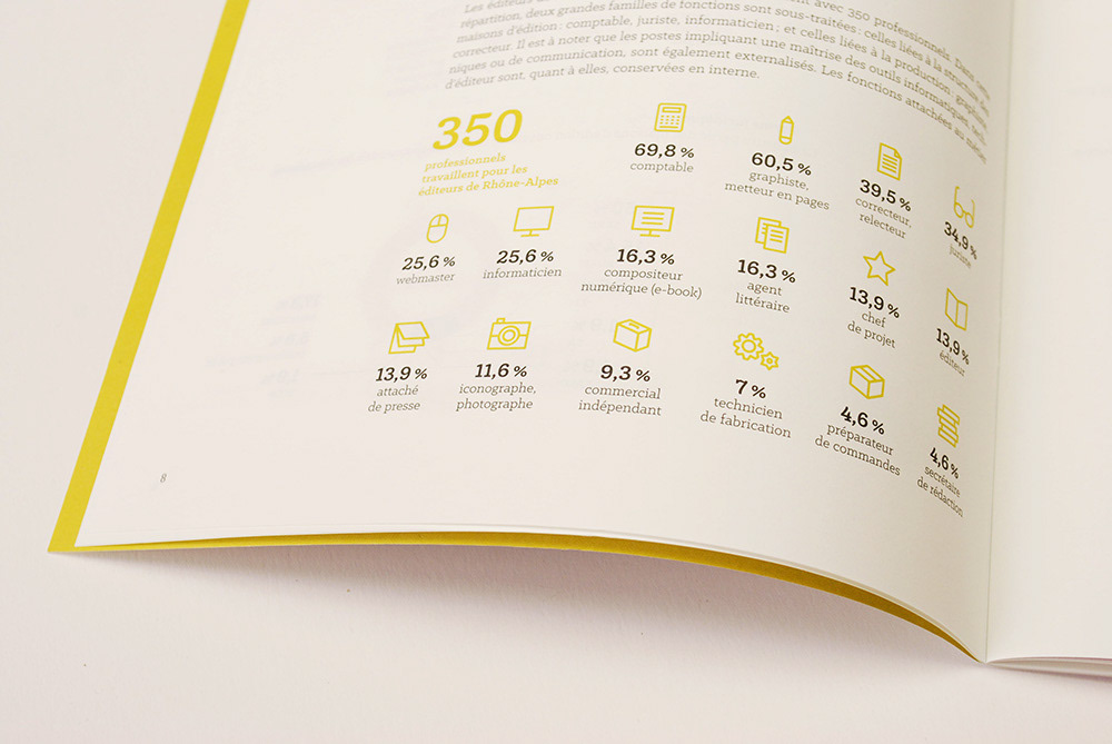 Baromètre régional de l'économie du livre Conception graphique, mise en page et illustrations d'un document présentant différentes statistiques sur les librairies et les maisons d'édition en Rhône-Alpes — brochure (32 p., 21 × 29,7 cm), dépliant (8 p., 22 × 31 cm), 2016 — Auvergne-Rhône-Alpes Livre et Lecture, Lyon
