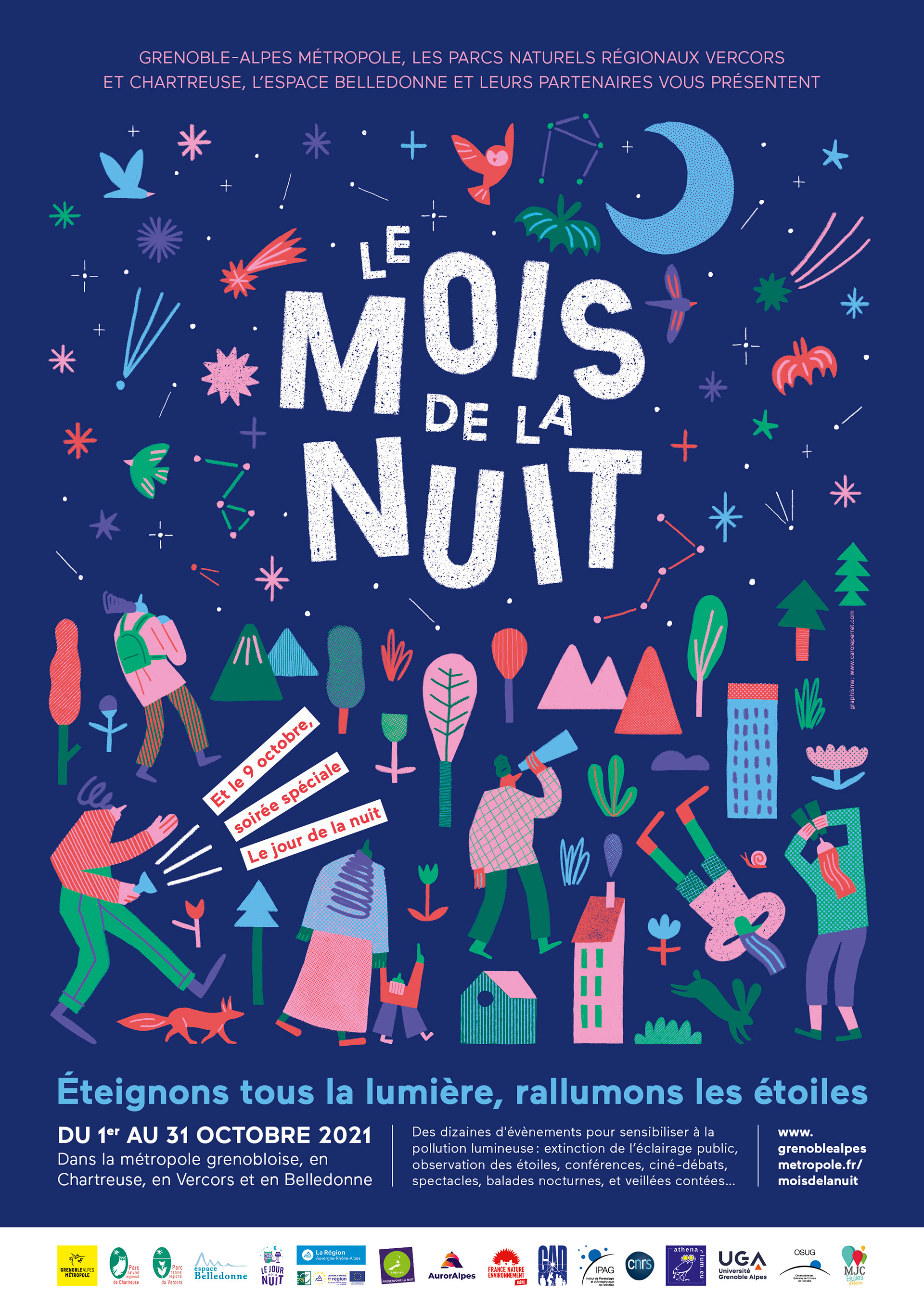 Le mois de la nuit Création de la communication de l'événement 2021 dans la métropole de Grenoble — affiches, programme (8 p., 14,8 × 21 cm), annonces-presse, écran tram, 2021 — Grenoble Alpes Métropole