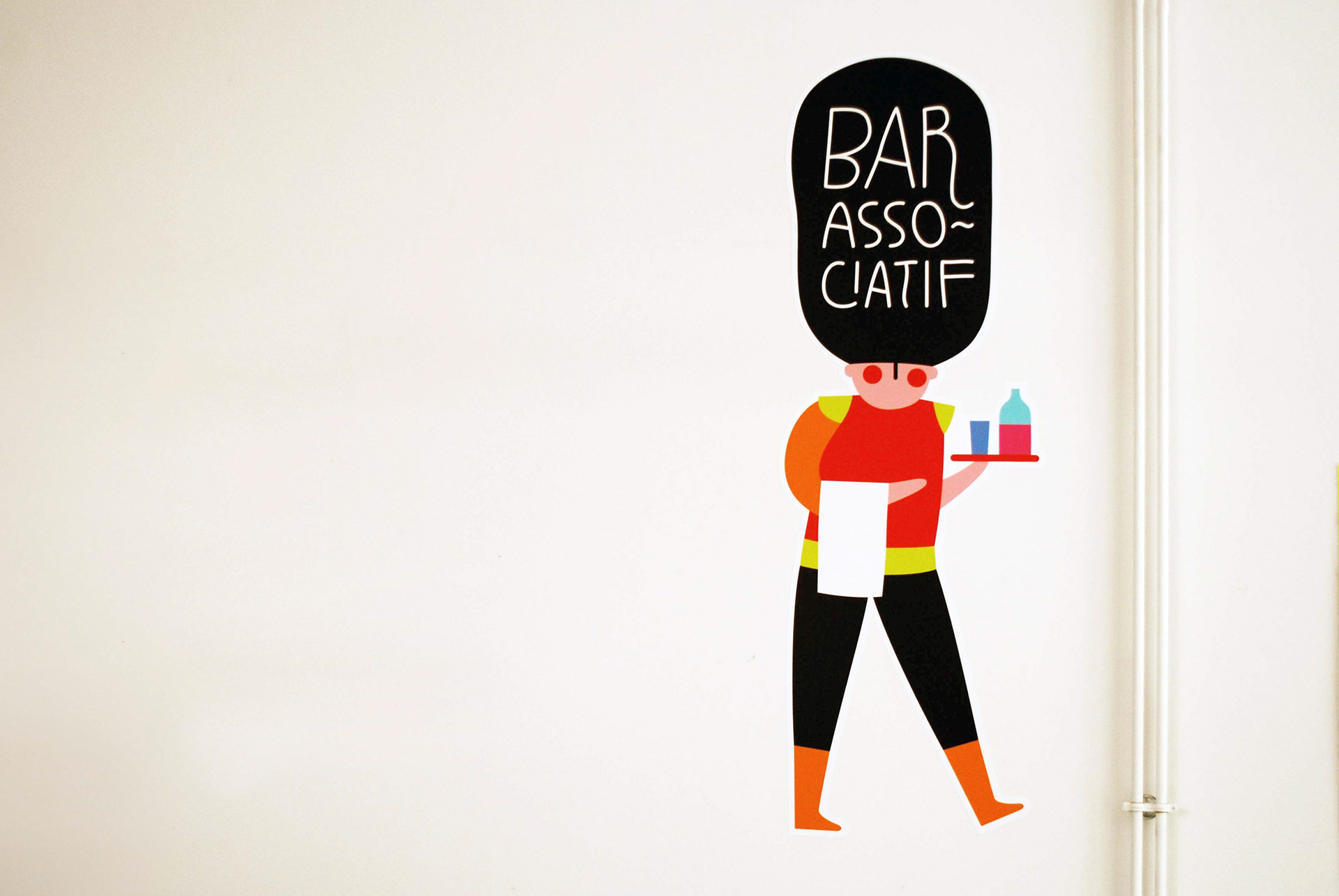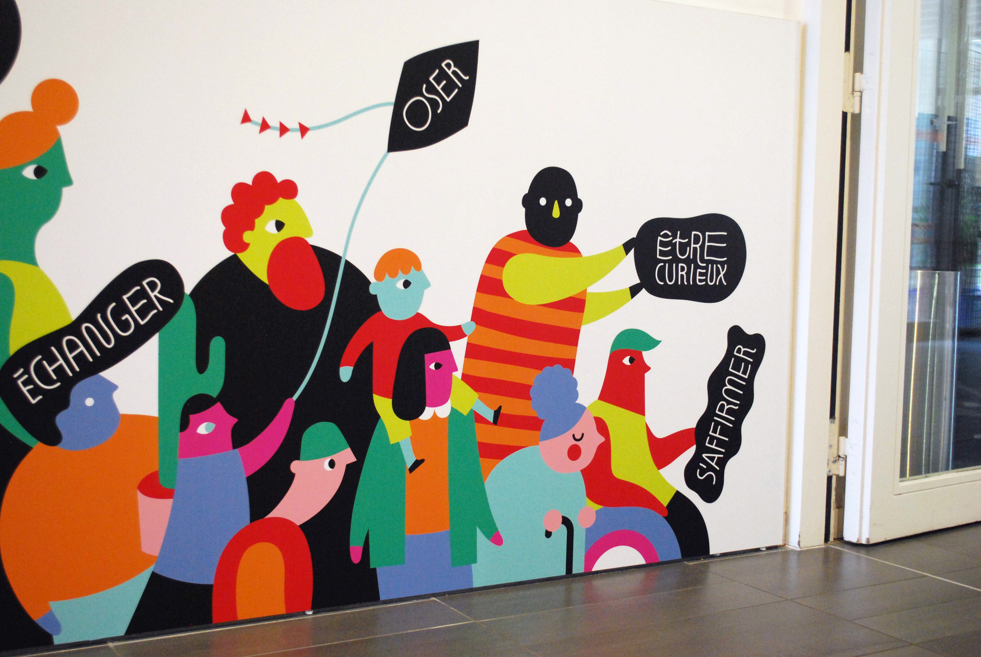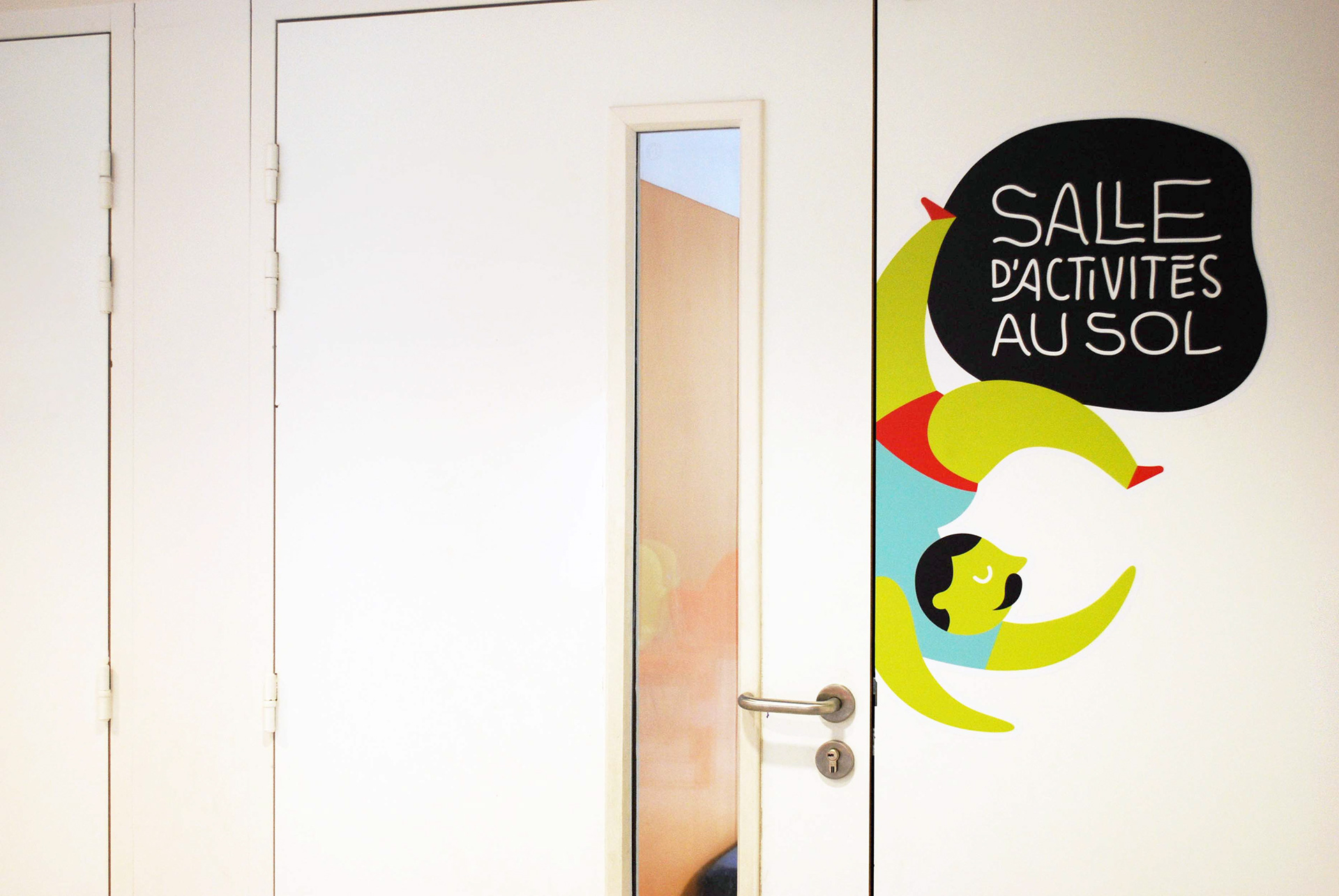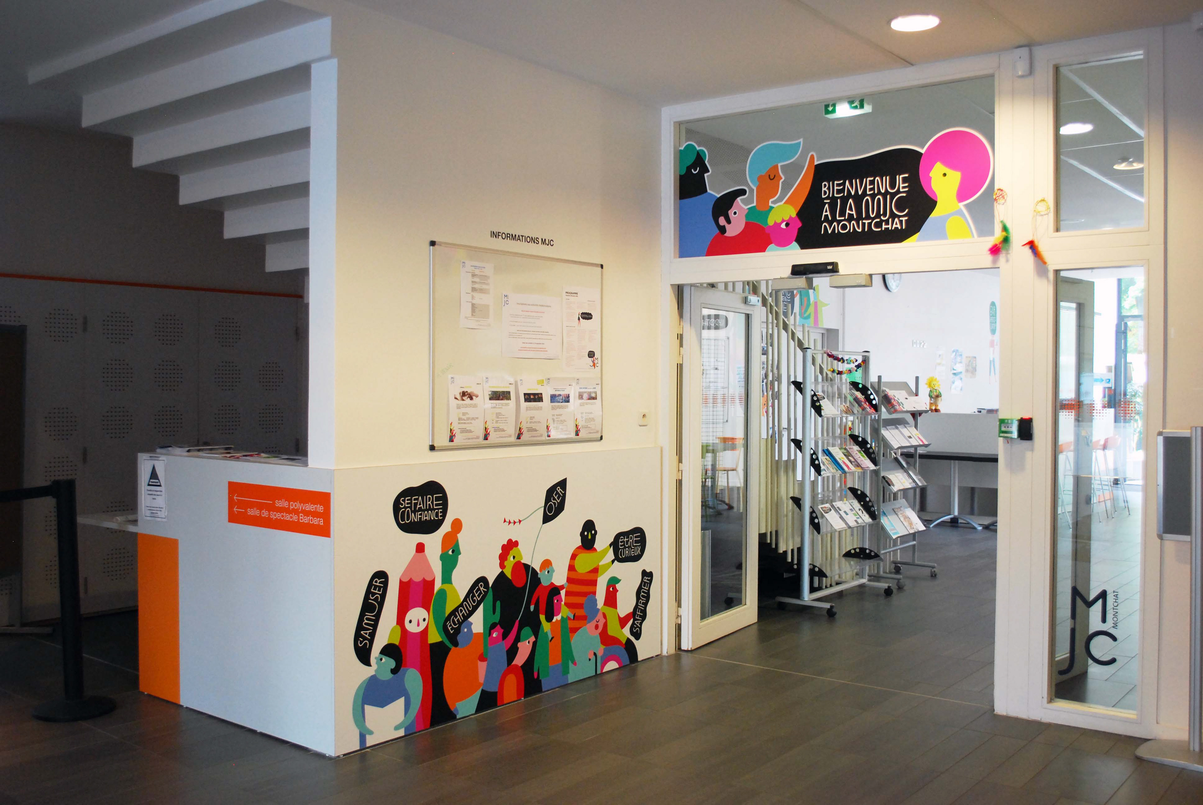 Bienvenue à la MJC Création d'une signalétique illustrée pour la MJC Montchat au sein de l'espace Elsa Triolet. Avec Julie Teulé (architecture d'intérieur, Lyon) — illustrations et lettrage (formats divers), 2016 — MJC Montchat, Lyon