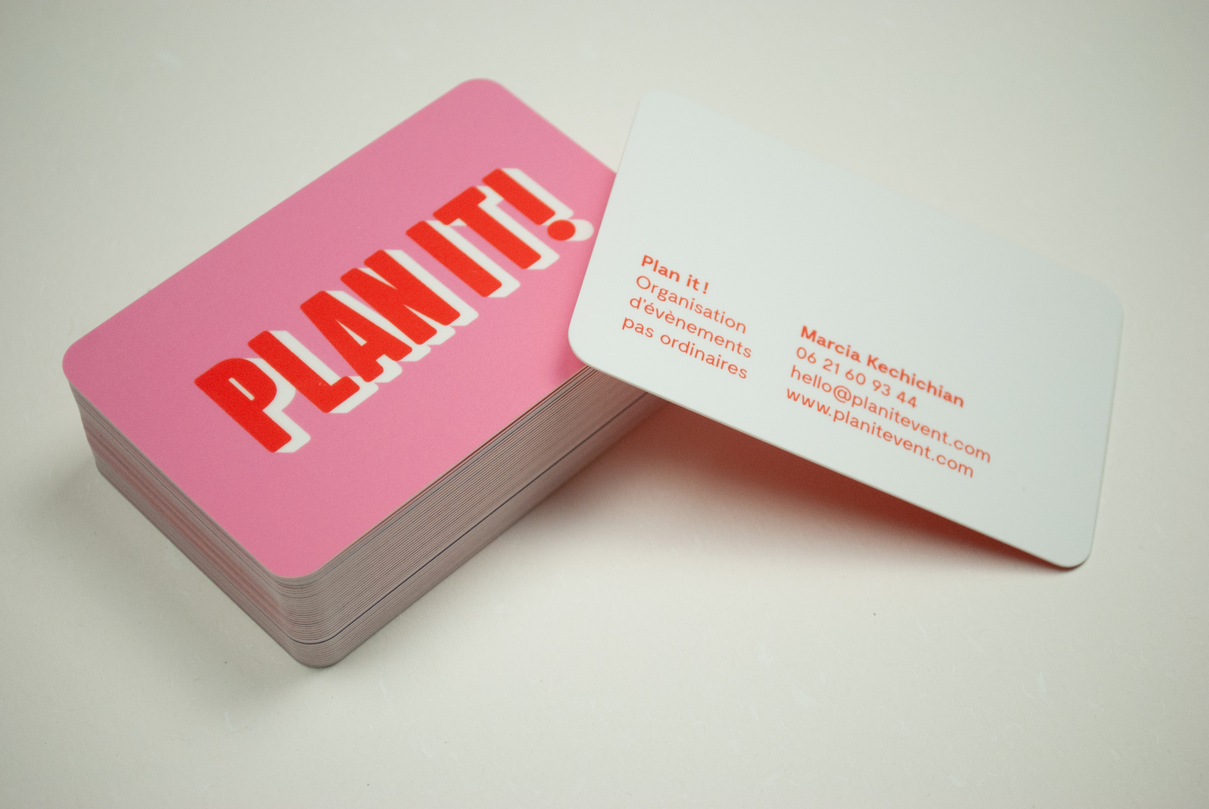 Plan it ! Création de l'identité de Plan it ! Organisation d'évènements pas ordinaires. Cartes de visite, papeterie, 2022 — Marcia Kechichian, Montpellier