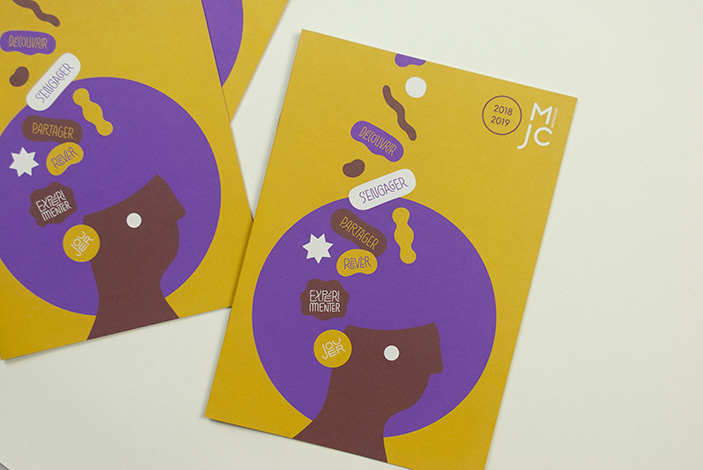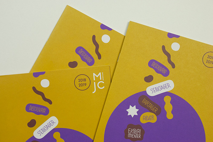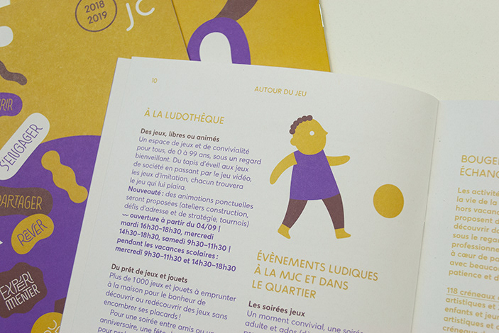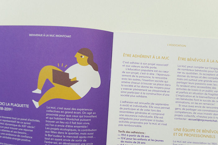 Programme 2018-2019 Illustrations et mise en page du programme des activités 2018-2019 de la MJC — brochure (16 p., 14,8 × 21 cm, impression 2 couleurs), 2018 — MJC Montchat, Lyon