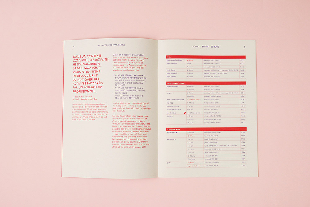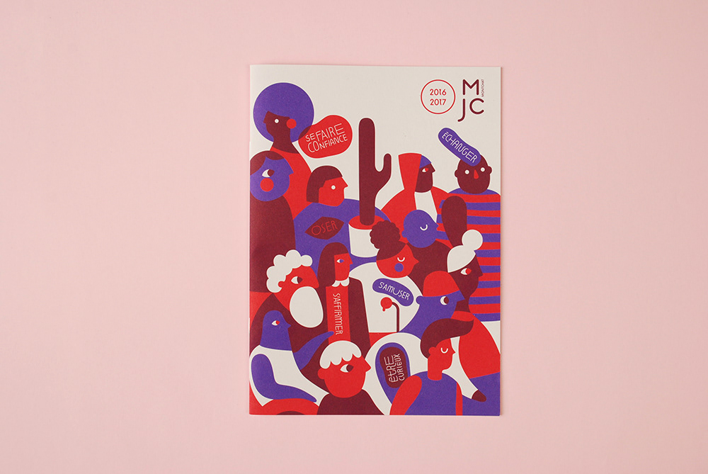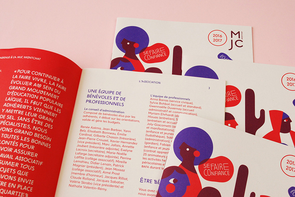 Programme 2016-2017 Illustrations et mise en page du programme des activités 2016-2017 de la MJC — brochure (16 p., 14,8 × 21 cm, impression 2 couleurs), 2016 — MJC Montchat, Lyon